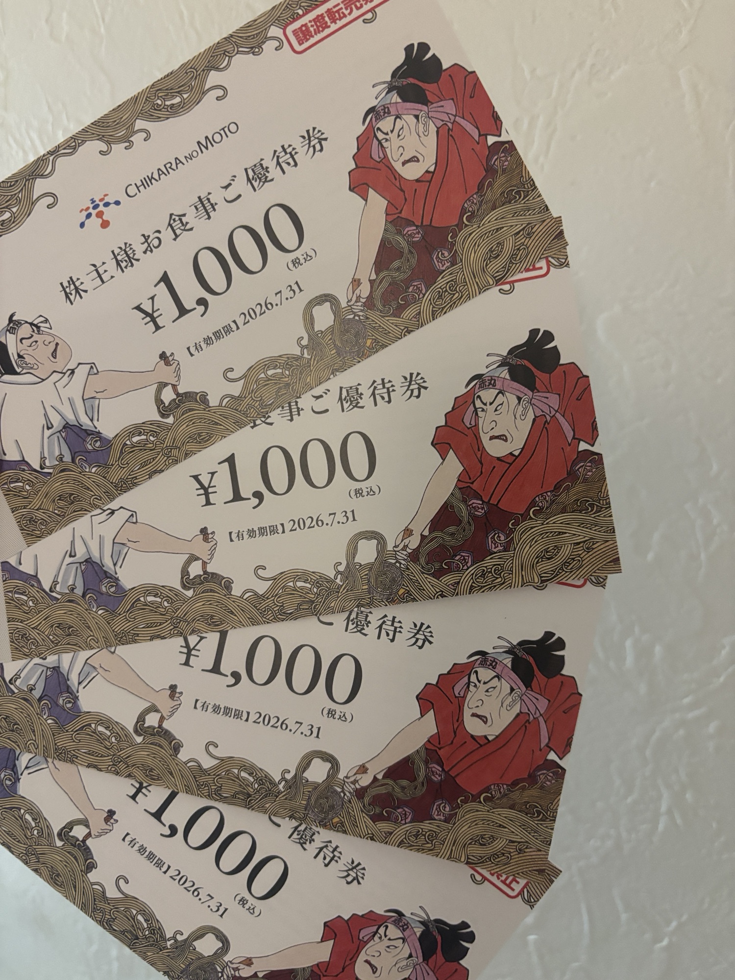 株 優待【株主優待到着】力の源HDからお食事券株 優待2026.02.01みなさんこんにちは。力の源HDからお食事券が届きました。久々のお食事券の到着。100株×2名義で4000円分いただきました。一風堂が有名ですよね。店内がきれいでテーブルにタブレットもあるし、お漬物が食べ放題だし。提供も早いです。もちろん美味しい。【株主優待】初取得の株主優待でラーメンランチこんにちは。氷河期世代、資産形成中のYueです。先日、初取得をした3561力の源HDからいただいた株主優待でラーメンを食べてきました。ラーメン大好きファッションビルの中にある店舗に家族3...株主優待情報はこちら↓(ヤフーファイナンスさんより)長期で優待が倍になるという太っ腹な優待です。—最後までお読みいただきありがとうございました。にほんブログ村にほんブログ村
