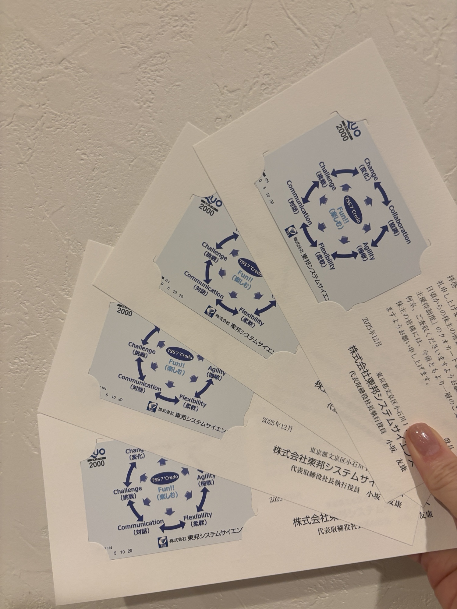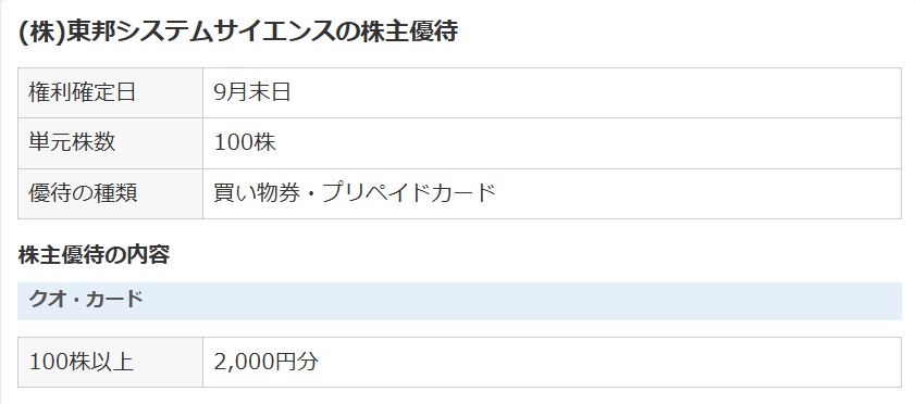 今回届いたのは4333東邦システムサイエンスさんからクオカード。
