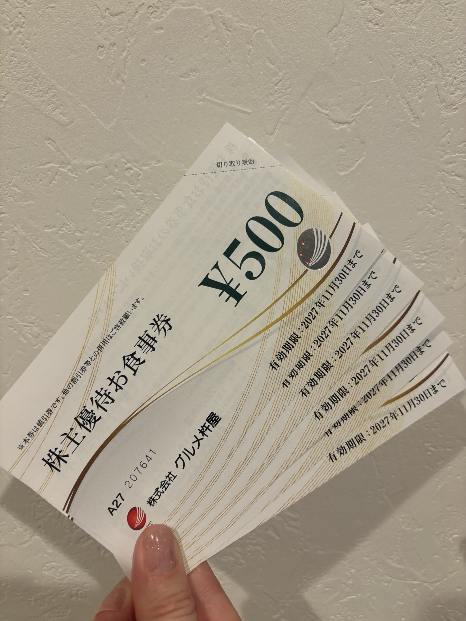 100株×3名義で1000円分のお食事券×3いただきました。