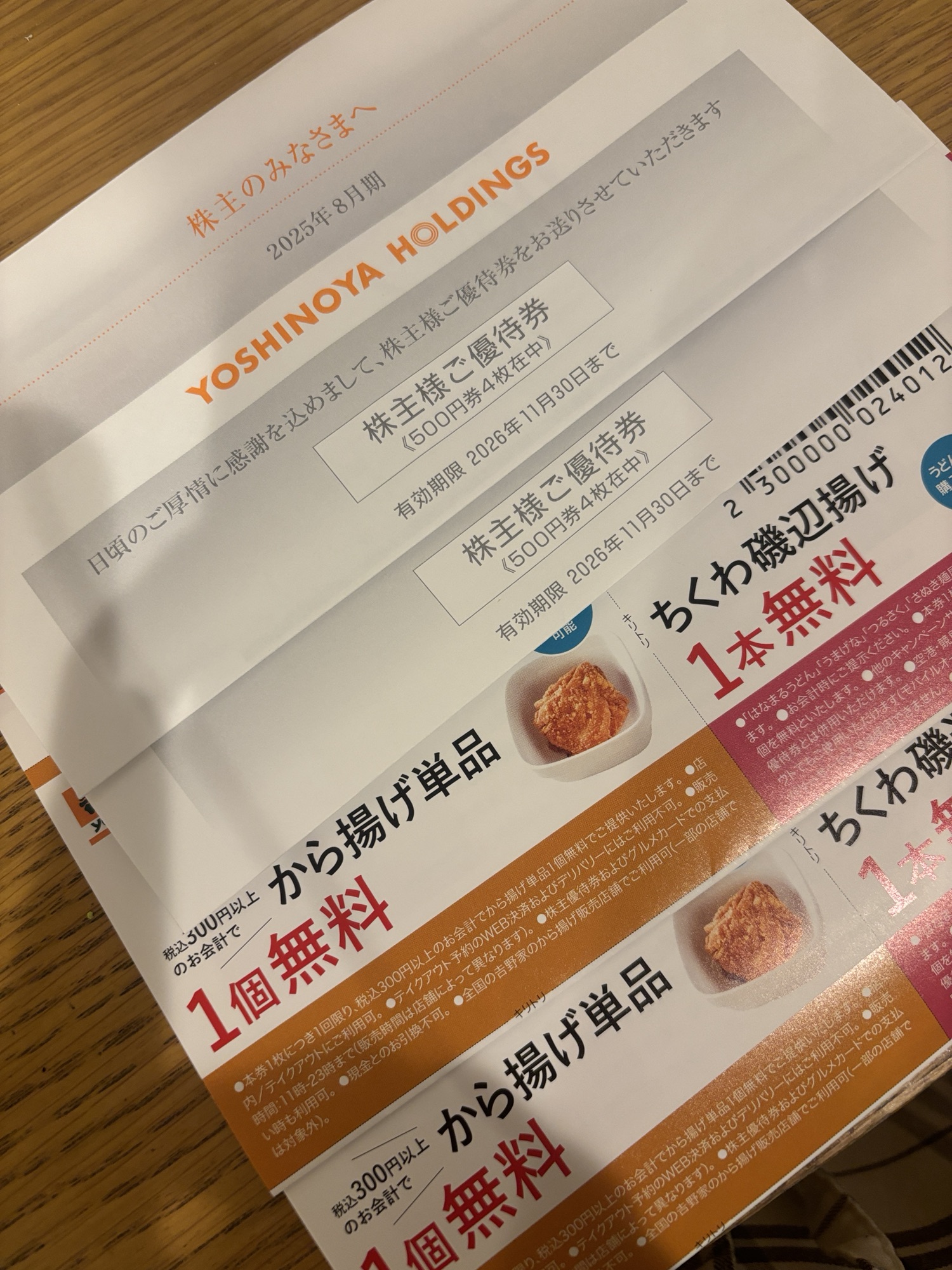 100株主×2名義、2000円分のお食事券×2と今回はからあげと天ぷらの無料券が1枚づつ。